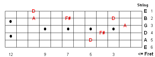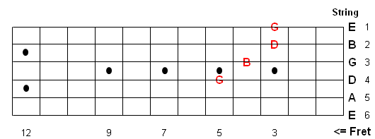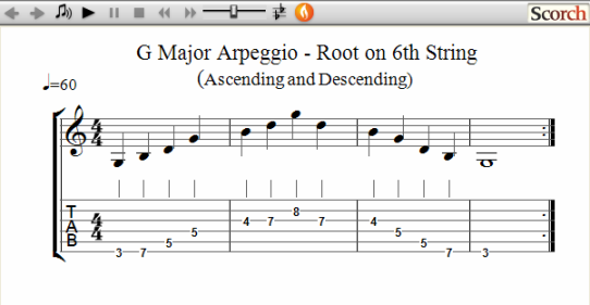 The G Major arpeggio notes are G-B-D as shown below with the Root (G) starting on the 6th string.