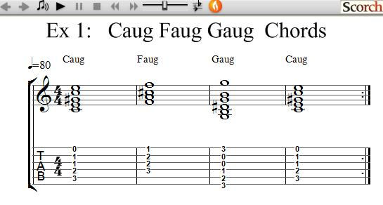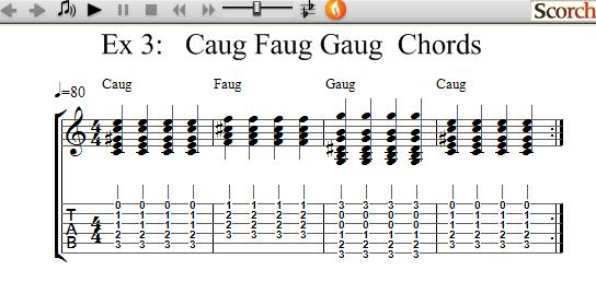 The following exercises use 3 Augmented chords each and show how to practice learning and changing between chords.