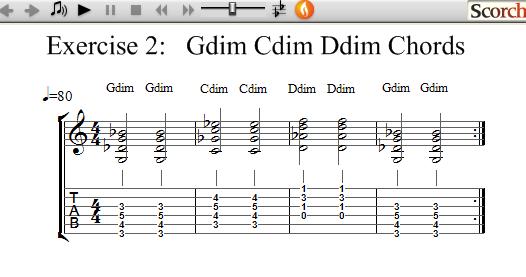 The following exercises use 3 Diminished chords each and show how to practice learning and changing between chords.