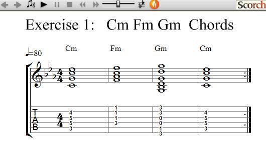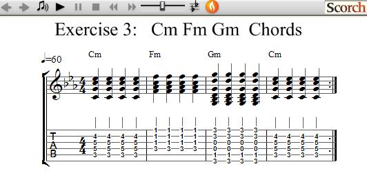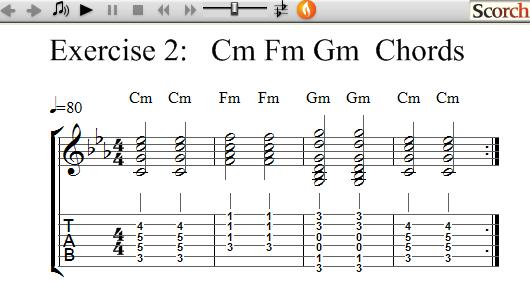 The following exercises use 3 Minor chords each and show how to practice learning and changing between chords.