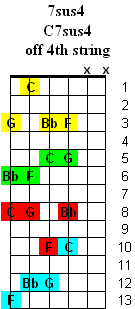 The 7sus4 chord is based on the 1st (Root) - 4th - 5th & b7th notes of a major scale. Inversions change the order of the notes by playing a different note as the lowest note of the chord. The chord symbols are written using a slash (/) such as C7sus4/F which means to play a C7sus4 chord with the F note as the lowest note in the chord. These chord symbols are common to other instruments such as keyboards.