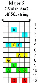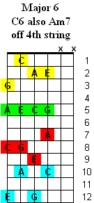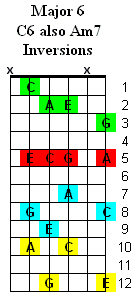 The Major 6 chord is based on the 1st (Root) - 3rd - 5th & 6th notes of a major scale. Inversions change the order of the notes by playing a different note as the lowest note of the chord. The chord symbols are written using a slash (/) such as C6/E which means to play a C6 chord with the E note as the lowest note in the chord. These chord symbols are common to other instruments such as keyboards.