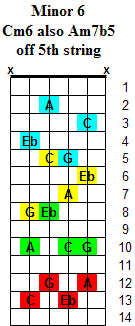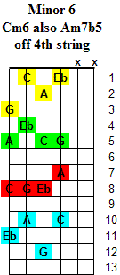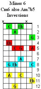 The Minor 6 chord is based on the 1st (Root) - b3rd - 5th & 6th notes of a major scale. Inversions change the order of the notes by playing a different note as the lowest note of the chord. The chord symbols are written using a slash (/) such as Cm6/Eb which means to play a Cm6 chord with the Eb note as the lowest note in the chord. These chord symbols are common to other instruments such as keyboards.