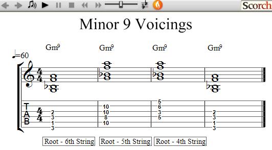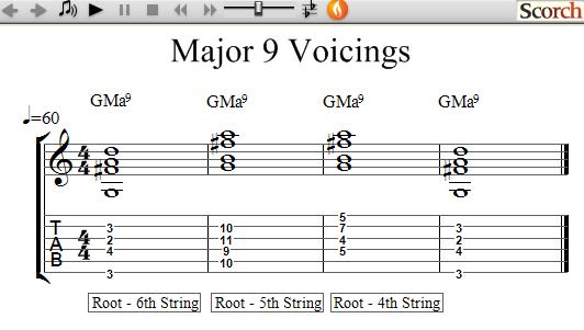 There are many variations of these voicings as such the more common ones are presented here. Inversions are also played using voicings and will be noted by the chord symbol. To explore more possibilities try including the use of alterations such as adding a #5, b5, #9, etc.,. All of these patterns are block forms and moveable.