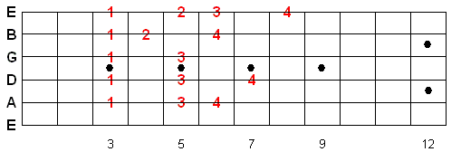 There are 3 types of scale fingering patterns shown below. The Caged system is the easiest pattern to learn and provides for a 2 octave range in 1 hand position. All of the numbers in RED are the suggested fingerings. Once you memorize this fingering pattern you can reuse it by moving up or down the fretboard. Whatever note you start on is the 1st note of the scale.