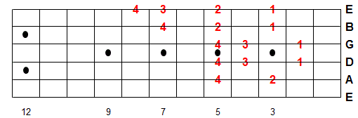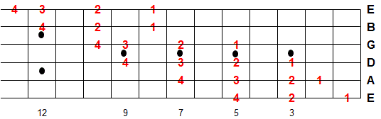 There are 3 types of scale fingering patterns shown below. The Caged system is the easiest pattern to learn and provides for a 2 octave range in 1 hand position. All of the numbers in RED are the suggested fingerings. Once you memorize this fingering pattern you can reuse it by moving up or down the fretboard. Whatever note you start on is the 1st note of the scale.
