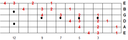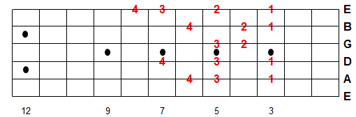 There are 3 types of scale fingering patterns shown below. The Caged system is the easiest pattern to learn and provides for a 2 octave range in 1 hand position. All of the numbers in RED are the suggested fingerings. Once you memorize this fingering pattern you can reuse it by moving up or down the fretboard. Whatever note you start on is the 1st note of the scale.
