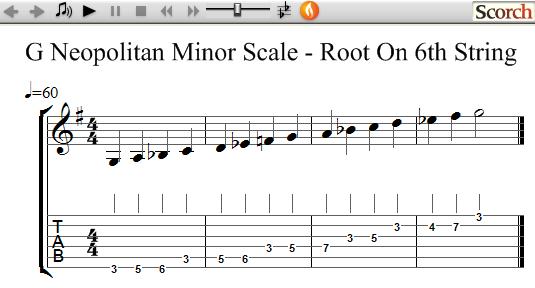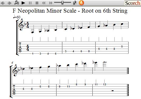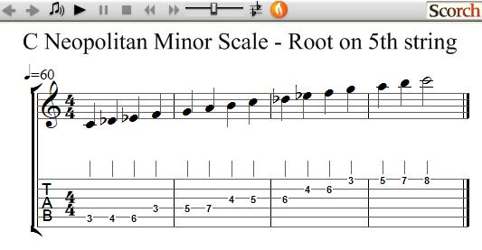The Neapolitan Minor scale is similar to a Minor scale with the 2nd, 3rd, 6th and 7th notes lowered by a half tone.