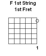 The Notes on the 1st String we will learn to read are E F & G with the Charts for this page created for Right-Handed guitarists. As you can see on these charts, the Note E is played as the 1st String Open, F is played by holding your Left Hand 1st finger on the 1st Fret while G is played with the Left Hand 3rd finger on the 3rd Fret: