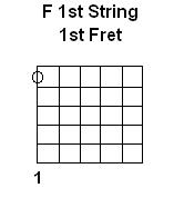 The Notes on the 1st String we will learn to read are E F & G with the Charts for this page created for Left-Handed guitarists. As you can see on these charts, the Note E is played as the 1st String Open, F is played by holding your Right Hand 1st finger on the 1st Fret while G is played with the Right Hand 3rd finger on the 3rd Fret: