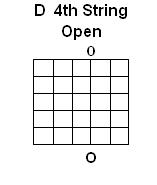 The Notes on the 4th String we will learn to read are D E & F with the Charts for this page created for Left-Handed guitarists. As you can see on these charts, the Note D is played as the 4th String Open, E is played by holding your Right Hand 2nd finger on the 2nd Fret while F is played with the Right Hand 3rd finger on the 3rd Fret: