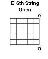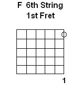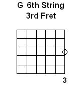 The Notes on the 6th String we will learn to read are E F & G with the Charts for this page created for Left-Handed guitarists. As you can see on these charts, the Note E is played as the 6th String Open, F is played by holding your Right Hand 1st finger on the 1st Fret while G is played with the Right Hand 3rd finger on the 3rd Fret: